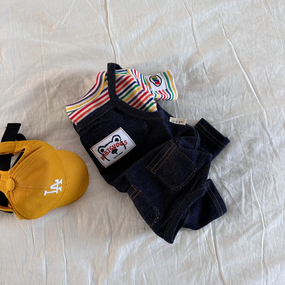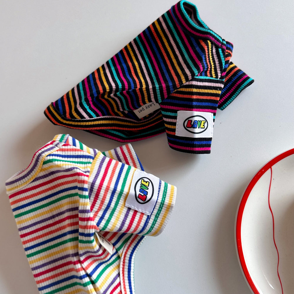 A playful crop tee made from colorful rainbow ribbed fabric. Soft, stretchy, and lightweight, this piece adds a cheerful pop of color while keeping your pup comfortable all day. Perfect as a stylish statement for everyday wear.